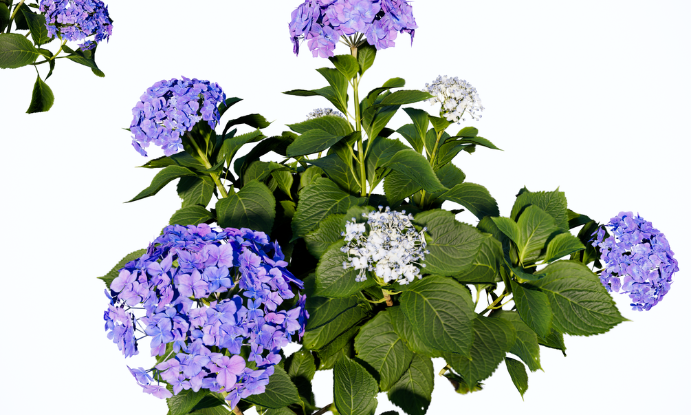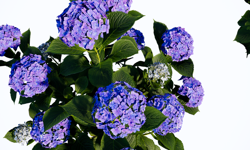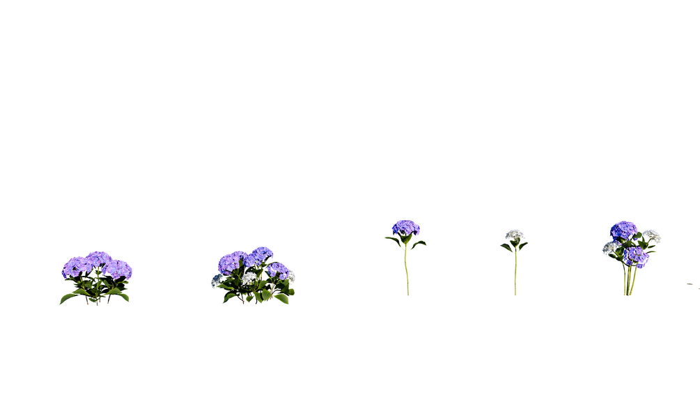Houseplant_Flowering - Aseet includes 15 hydrangea plants and leaves.